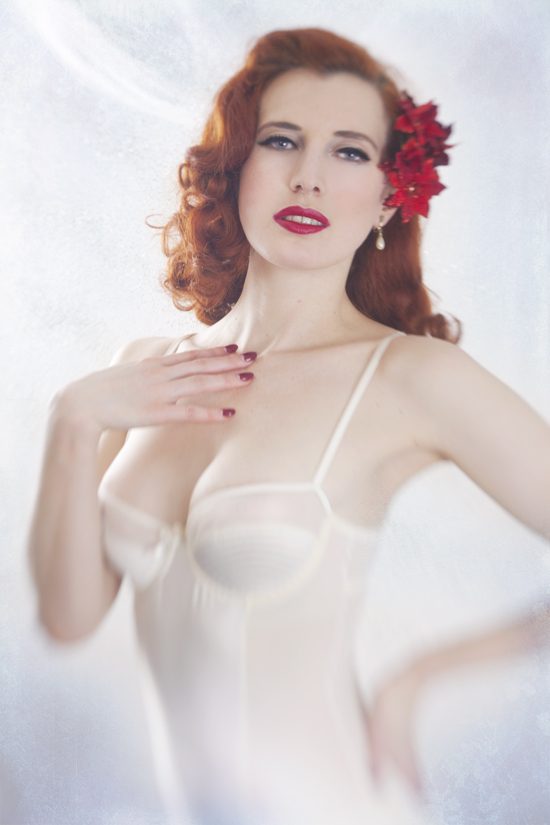 Sophia was photographed wearing Playful Promises’ Kitty garter dress. A sleek ivory tulle and satin panel garter dress with stitch detailing and mesh finish for a rather retro look. Team this with retro stockings for that virginal image this January!